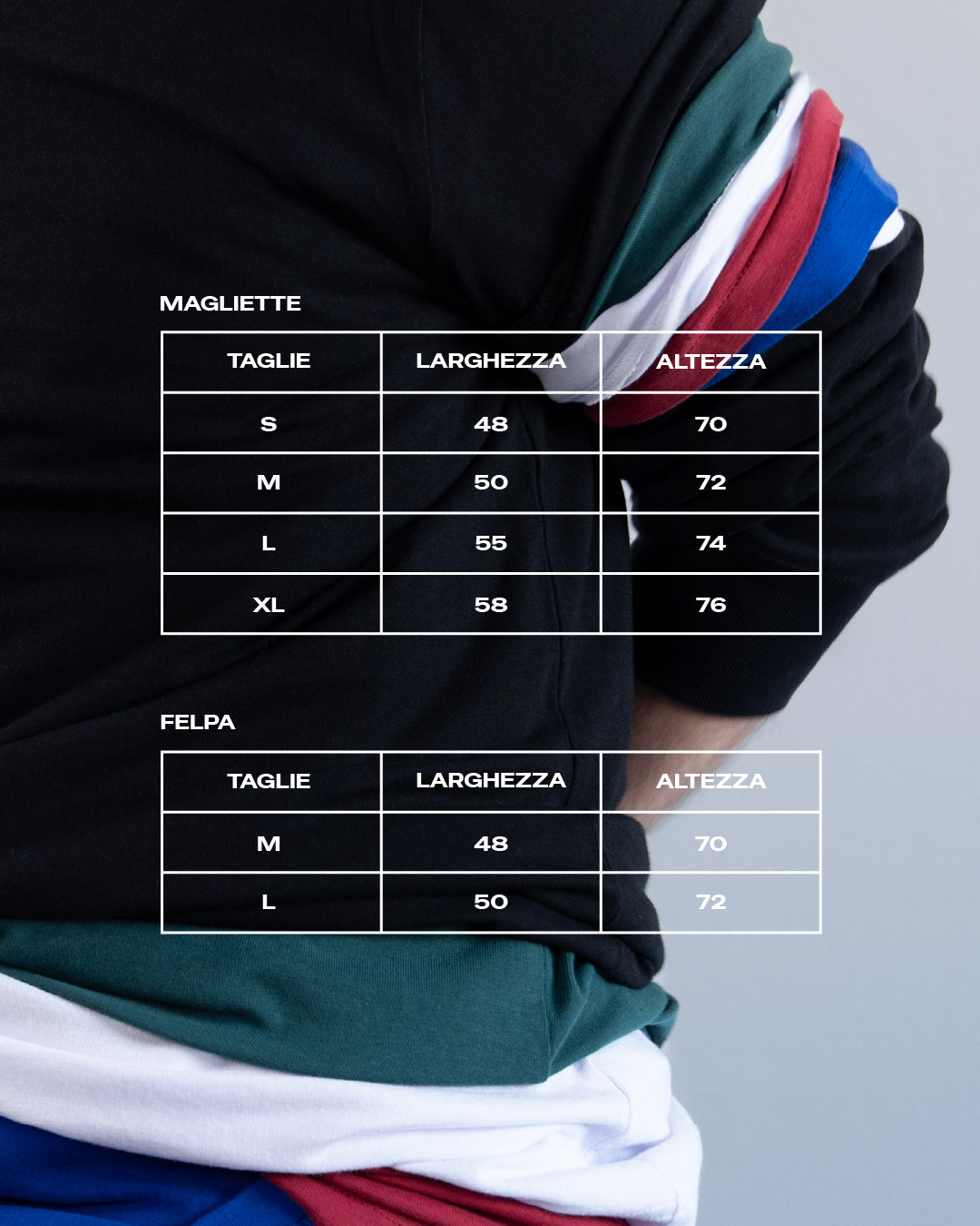 ATTENZIONE ATTENZIONE: puoi scegliere la taglia della maglietta, MA delle felpe ci è rimasta solo la L. Quindi qualunque taglia tu scelga per la T-Shirt, nella sacca troverai una felpa taglia L.